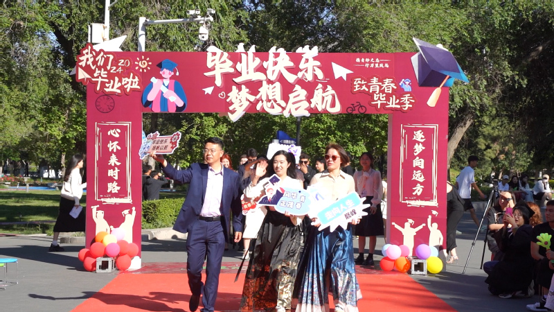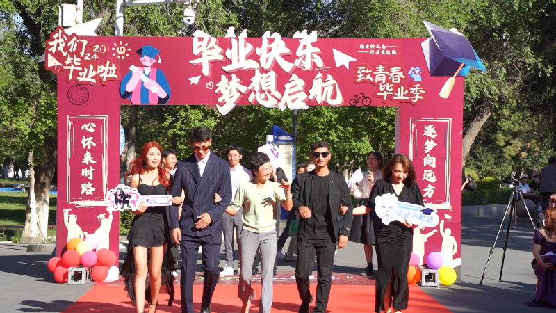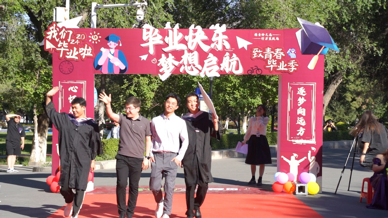 毕业典礼前,毕业生们携同家长、亲友、同学、老师穿过毕业门,走上红毯款款而来,走向他们的毕业时刻。