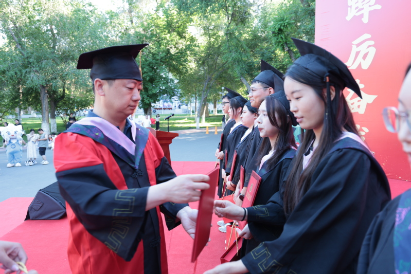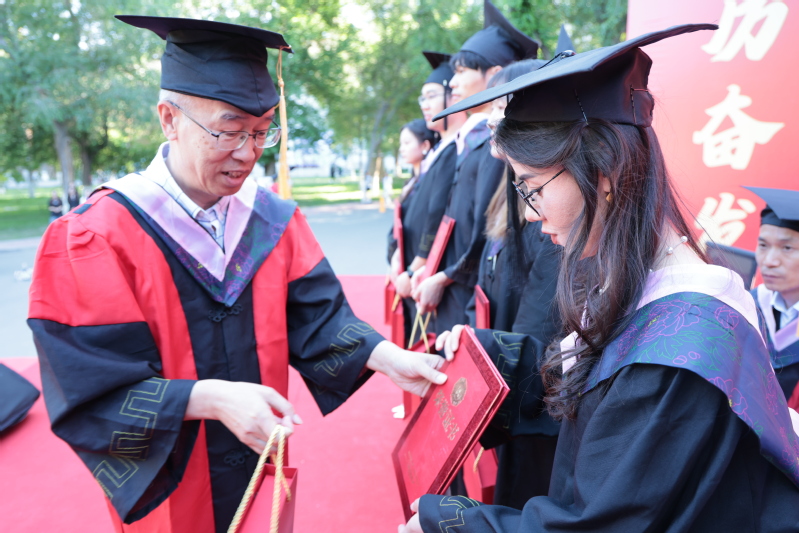 伴随着激昂的乐曲,学院领导、学术委员会委员为全体毕业生拨穗正冠并颁发学位证书及纪念礼品。