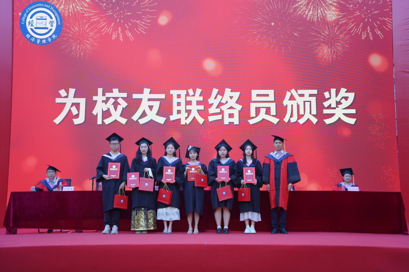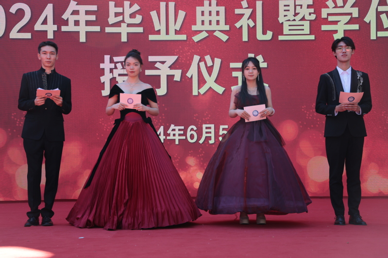 党委书记何峰宣读了优秀毕业生表彰决定并颁奖;院长余国新宣读优秀毕业论文表彰决定并颁奖;副院长夏咏宣读了2024届毕业生考研之星表彰决定并颁奖;党委副书记钱树斌宣读了2024届校友联络员名单并颁发纪念品,获奖学生代表依次上台领奖。